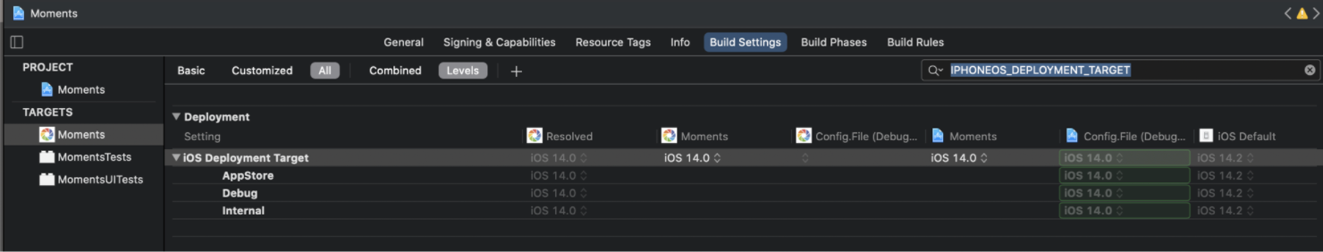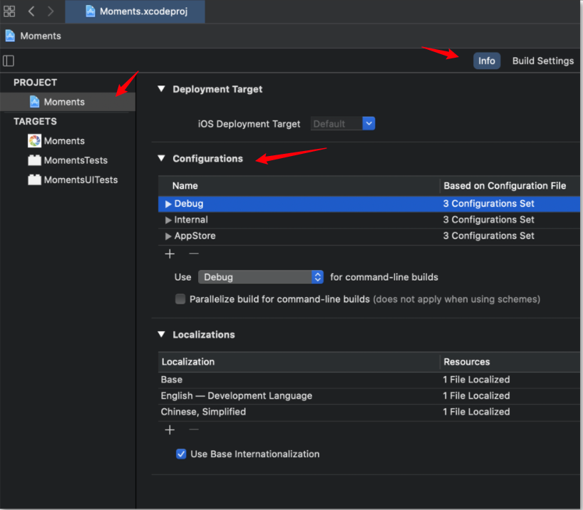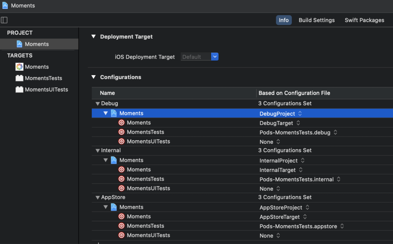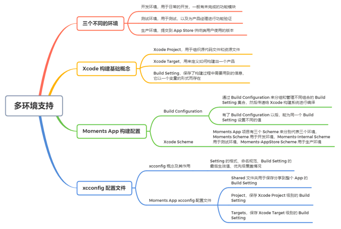 - 为了方便管理,我们通常的做法是,一个 Scheme 对应一个 Configuration。有了这三个 Scheme 以后,我们就可以很方便地构建出 Moments α(开发环境),Moments β(测试环境)和 Moments(生产环境)三个功能差异的 App。