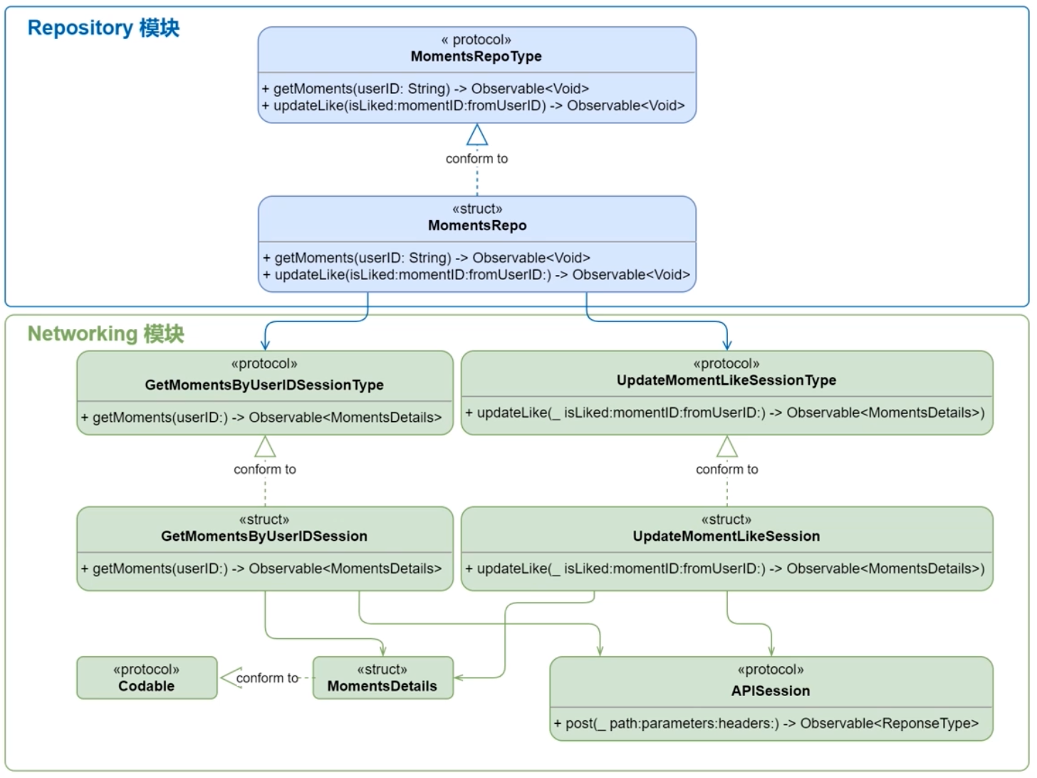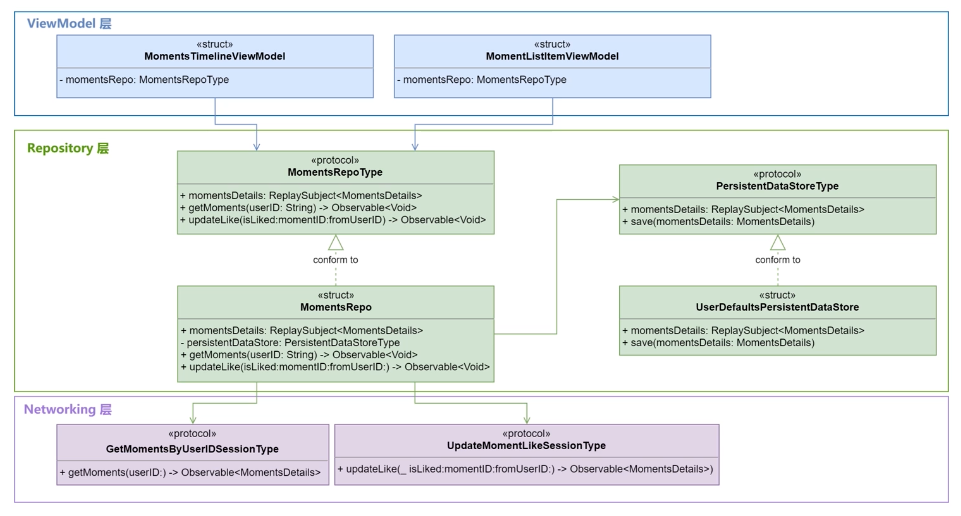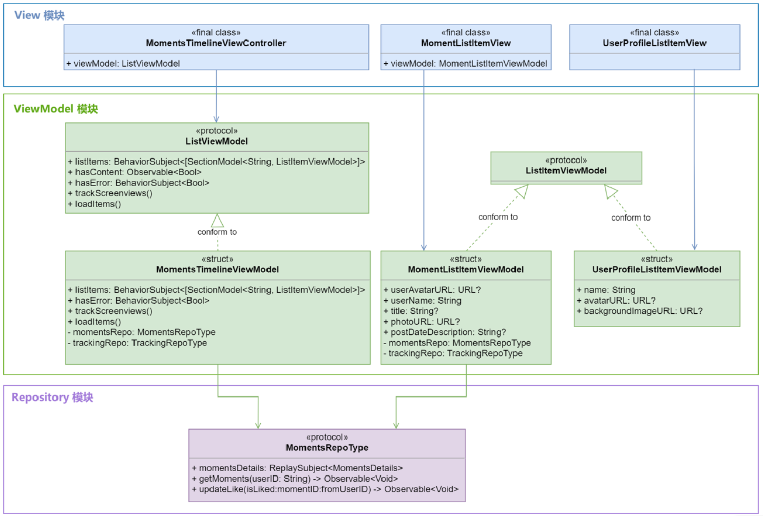 为了把这些 ViewModel 类型桥接到 SwiftUI 版本的 View 模块,我们增加了两个类型:MomentsListObservableObject和IdentifiableListItemViewModel。MomentsListObservableObject负责给 SwiftUI 组件发送更新消息,下面是它的具体实现: