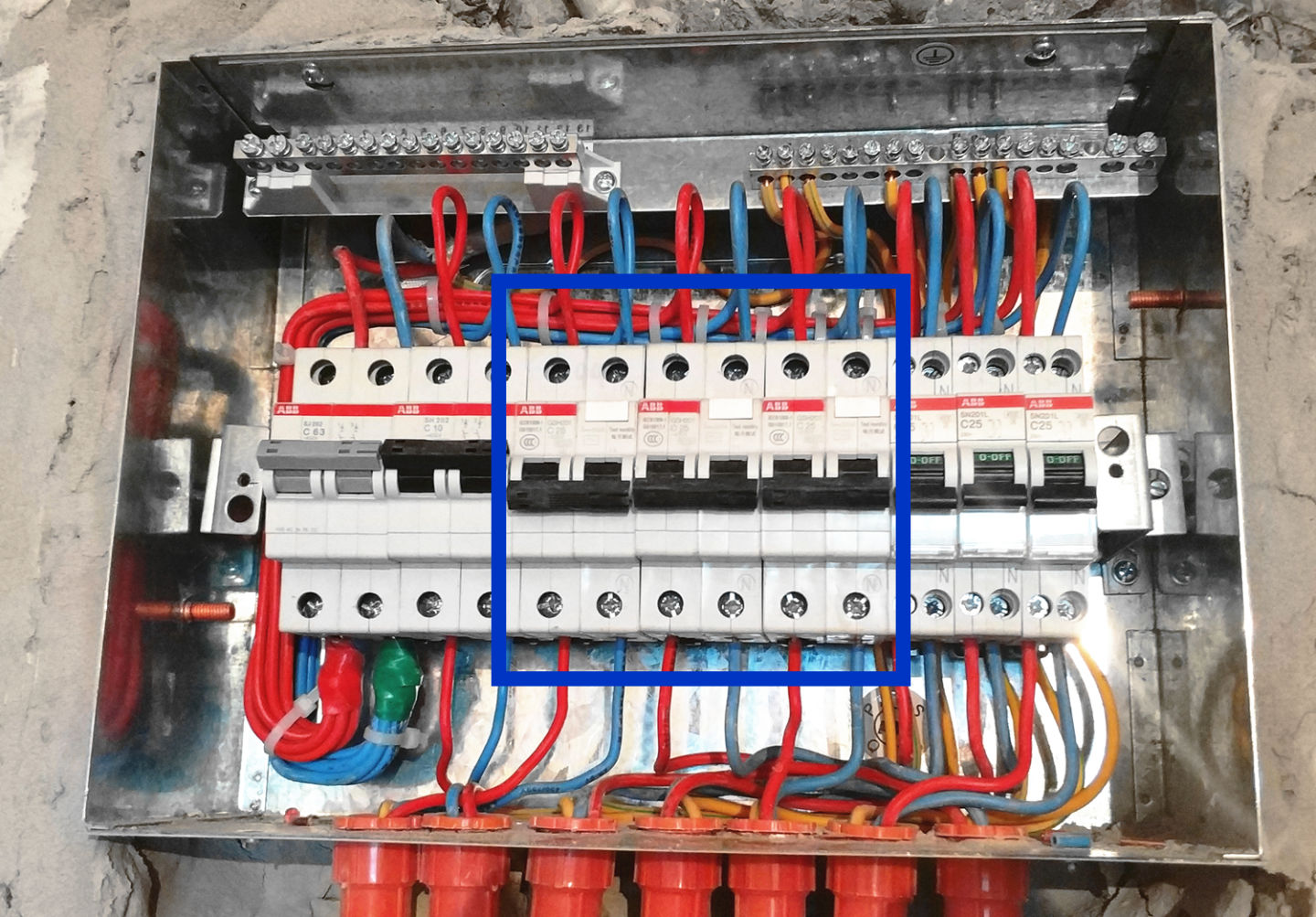 上图蓝框为三个插座回路三个1P漏保