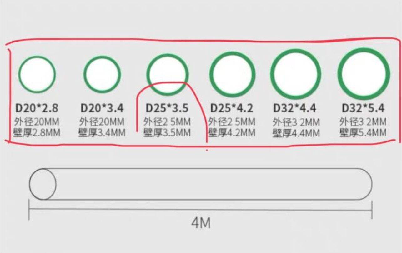 冷水管壁厚2.8~3.5mm,有蓝绿色标示线,热水管约4.2mm,标示线为红色。有预算的话,可全用热水管,参考下图,即选用D25规格的管即可(即6分管)。