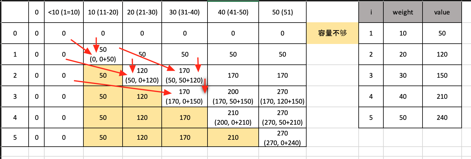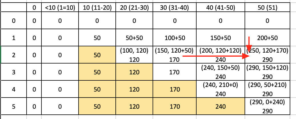 - 表格说明, X轴是代表容量, 因为这个例子是以10为跳跃和的, 所以我就每10个聚合在一起了, 又因为显示是以[i][j]这样的形式, 它们在数组上的意义比实际要多1, 注意必要的加减1的判断