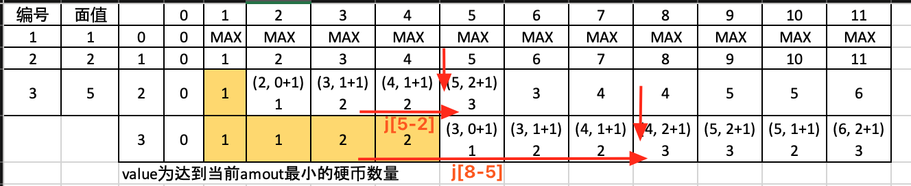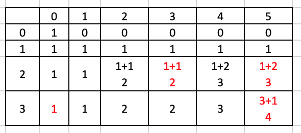 1+2=3, 前面的1来自上一行, 说明不用2的情况下已有1个解能凑出5块- 后面的2来自同一行, 说明有2种办法拼出3, 这样加上自己的2, 就是5