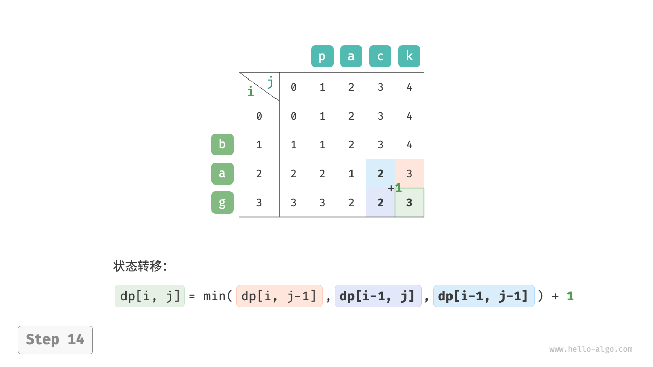 ba转成"", 需要两步, 删除b和aba转成p, 同理, 先删除一个字母, 再替换一个字母, 两步ba转成pack,b转成p, 添加c和k- 它所有的可选方案就是左上角的所有可能性(哪怕最极端的, 退回空串, 再依次添加), 显然, 选最贴近的三个方案做比较就好了, 没必要退得那么远