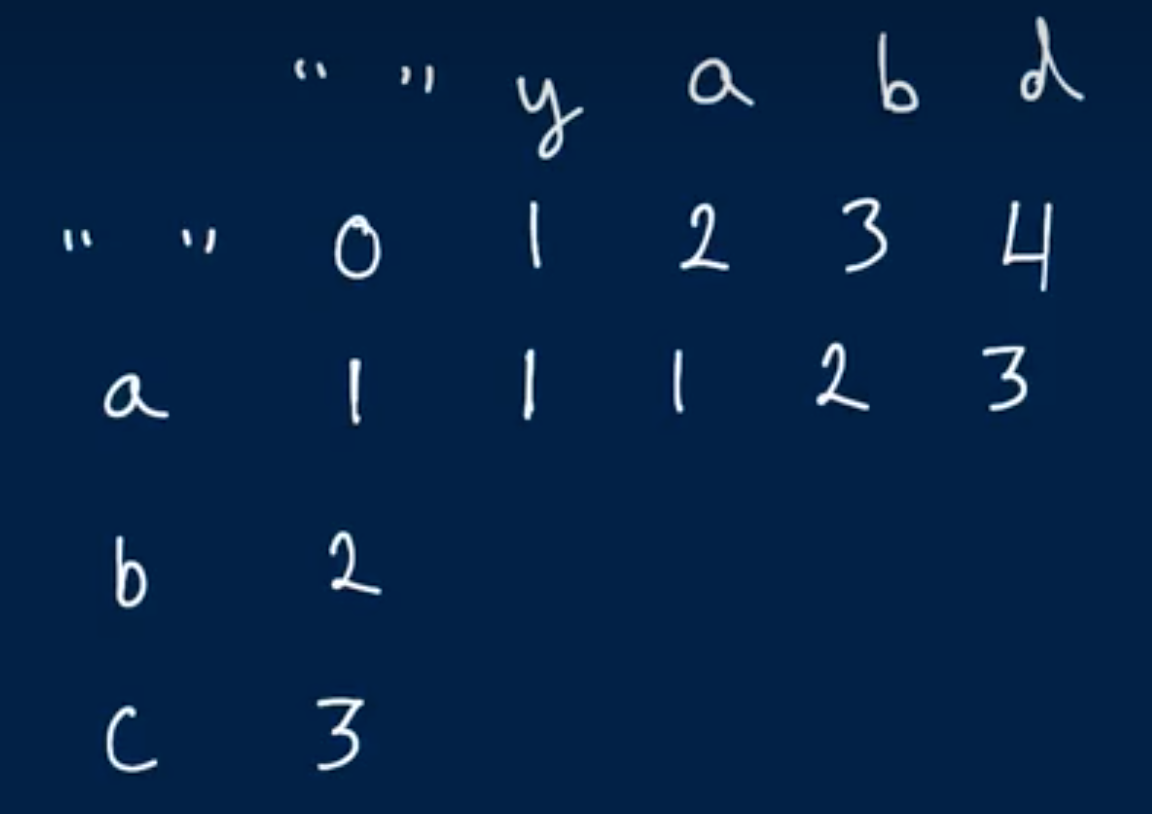 把道理讲明白, 那又得借助国外的教材了, 这里, 把abc转成yabd, 做矩阵, 它不是告诉你要初始化首行和首列为0,1,2,3,4, 而是先各加一个空字符串, 意思是整个表都是怎样把左侧的字符串转成右侧的字段串