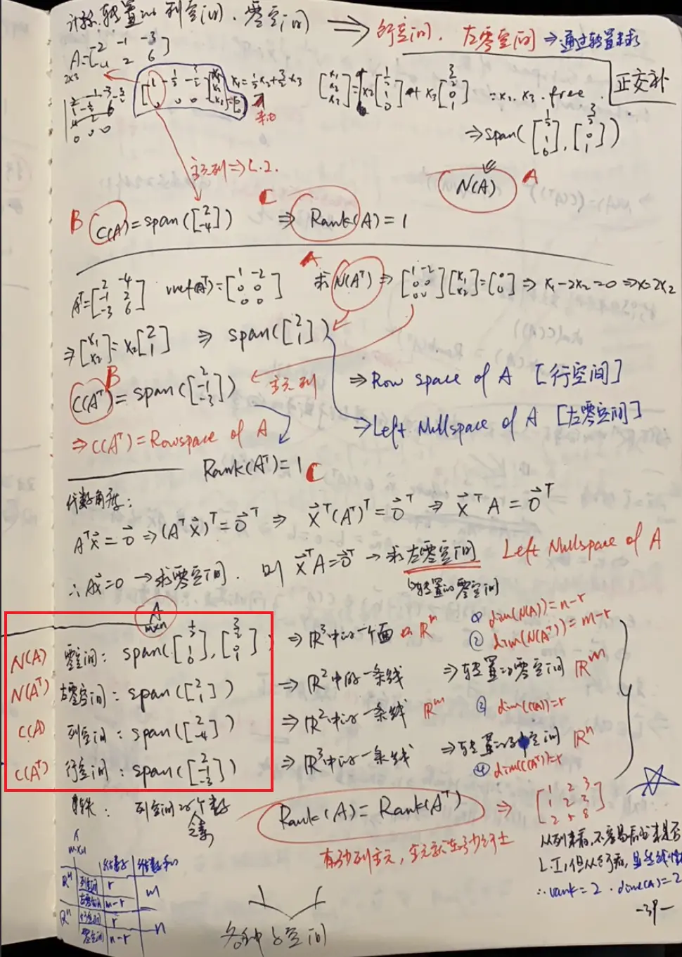 上图用红框框出来的部分即是具体这个矩阵A的四个子空间。同时,拥有如下性质: