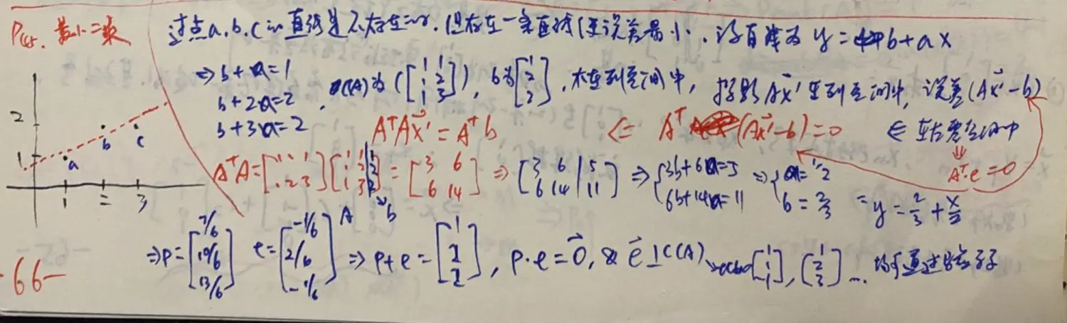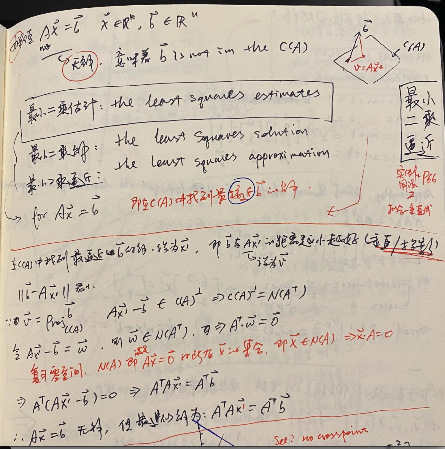 由此到了下一课,the lease squares approximation,讲的就是Ax=b无解时,意思就是在b不存在A的张成子空间中,所以无论进行怎样的线性变换,都是不可能得到b的,则取x在C(A)中的投影作为近似的解(证明就不再展开了)