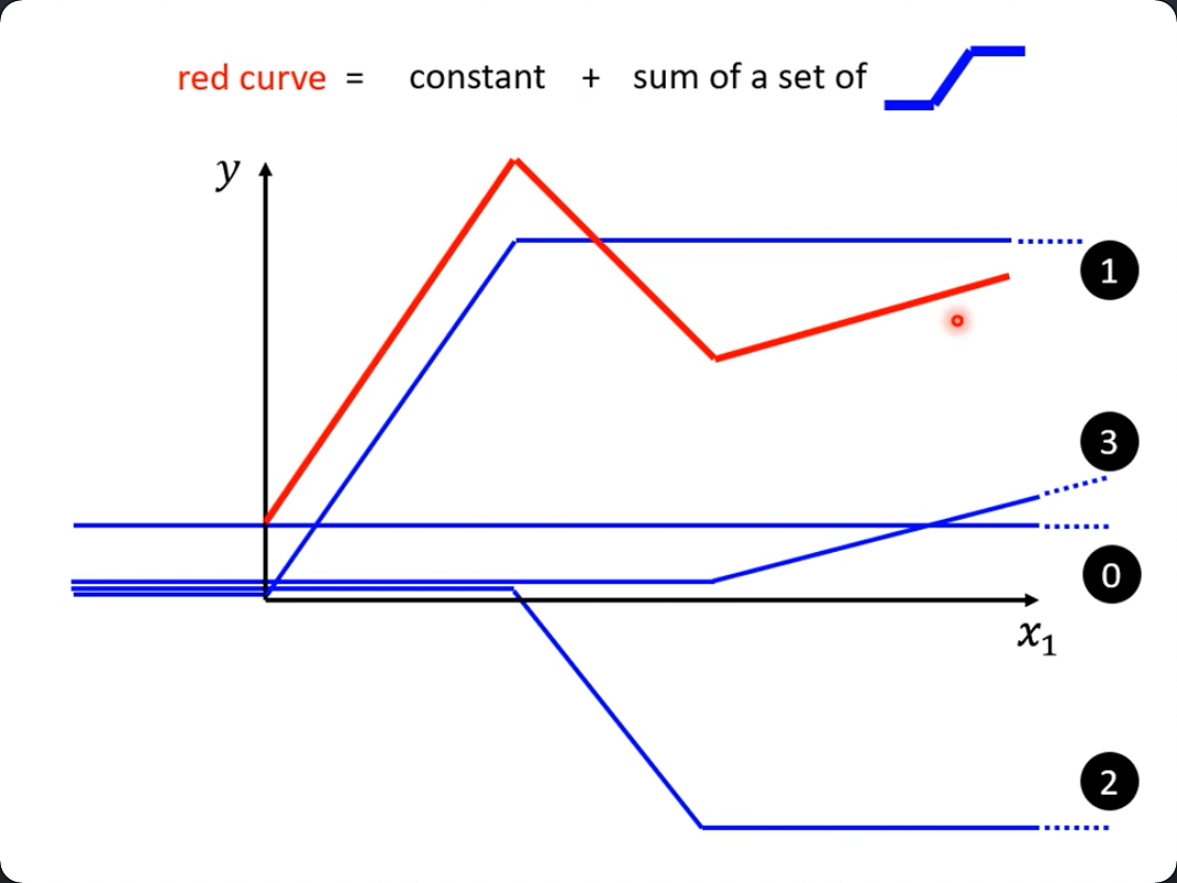 所以,最终成了一个常数(bias)和数个sigmoid函数来逼近真实的曲线。同时,每一个转折点i上s函数的具体形状(比如有多斜多高),就由一个新的线性变换来控制:,把i上累积的线性变换累加,就得到与最可能逼近的曲线。