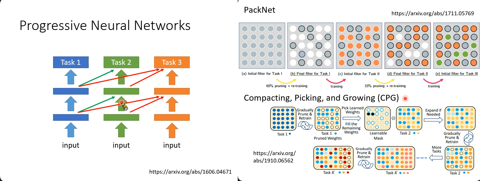 任务2里梯度要更新未必要往中心,也可以往中下方,这样既在任务2的低loss区域,也没有跑出任务1的低loss区域,实现的方式是找到对之前任务影响比较小的参数,主要去更新那些参数。比如上图中,显然对任务1的loss影响越小,但是更新它之后会显著影响任务2的loss,而的改动才是造成任务1loss变大的元凶。