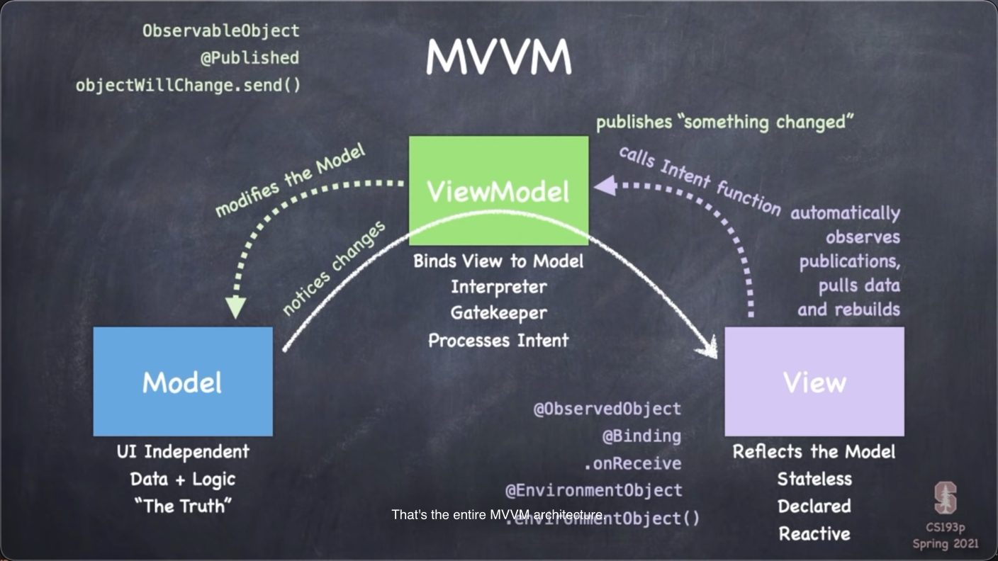 | Everything you’ve seen so far is a struct (except View which is a protocol) | The ViewModel in MVVM is always a class (also, UIKit (old style iOS) is class-based) |