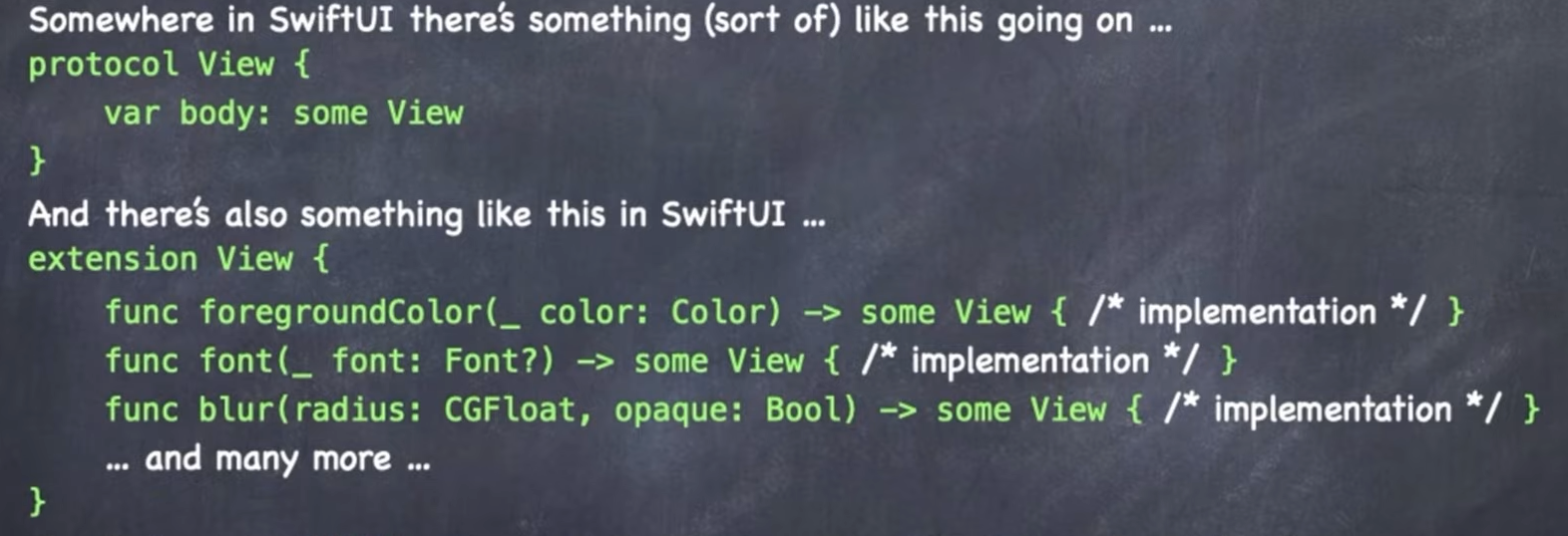 var body : some View {...}意思是你自己不需要实现View,但你要返回some实现了View的(别的)对象- 它是一个computed var,所以跟的{}就是一个function