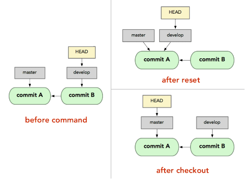 我们会用checkout切换分支,那么同样的命令改用reset呢?看示意图:
