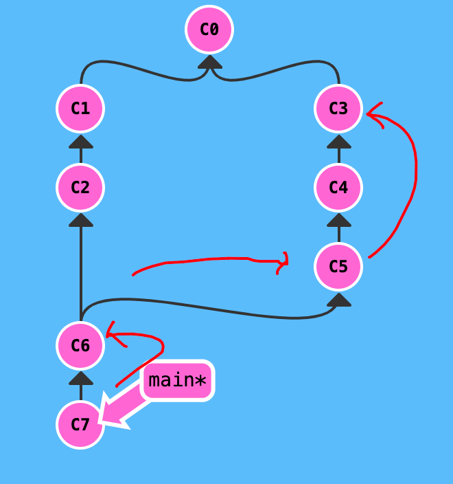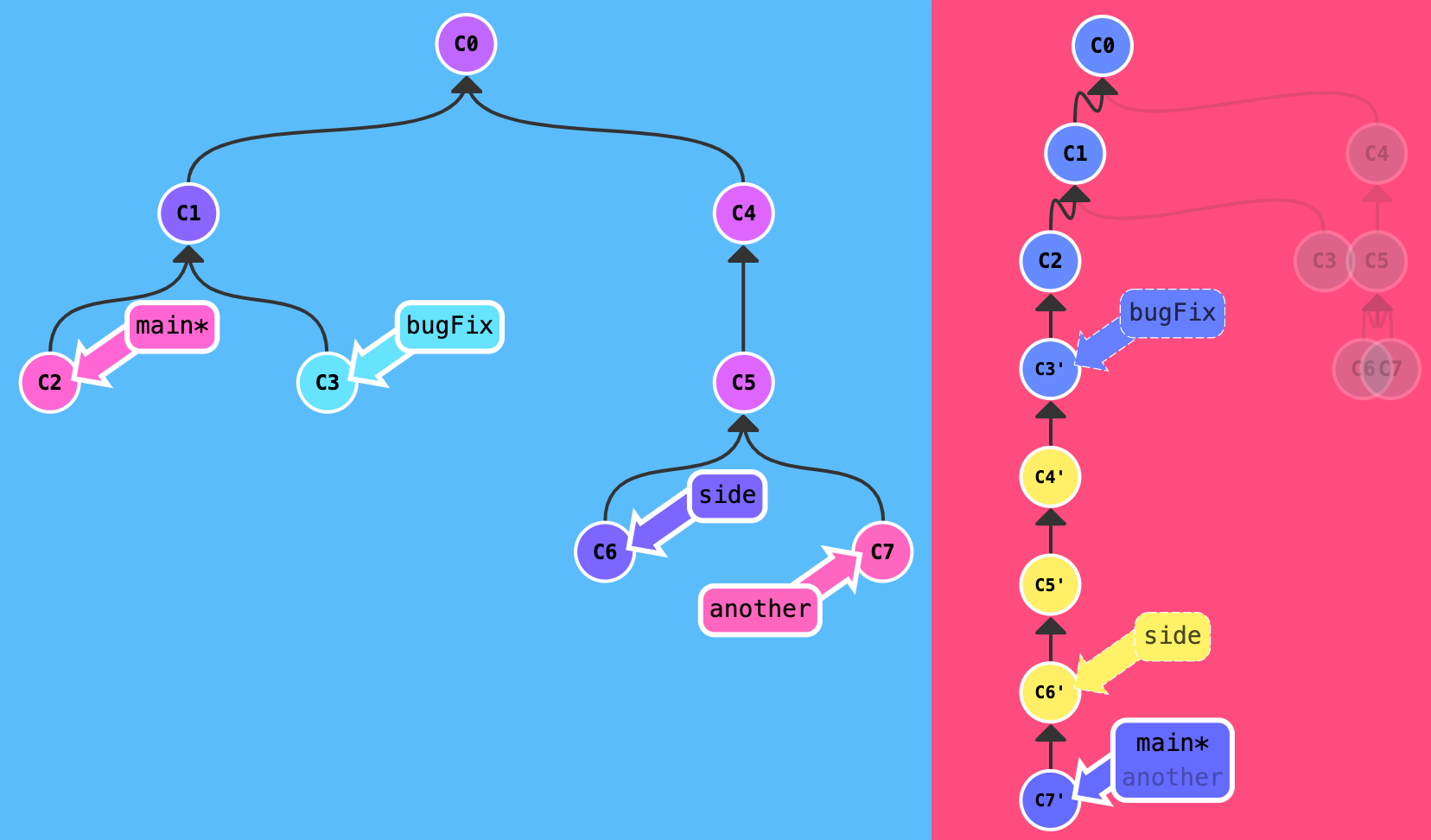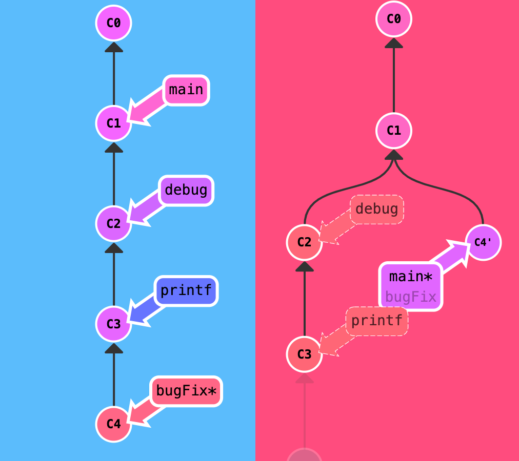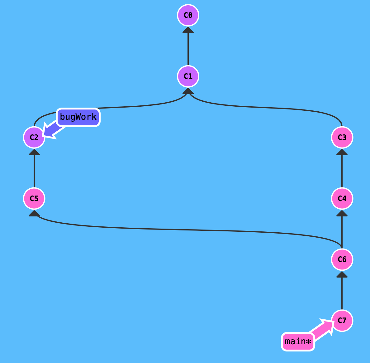 - 双参数是把参数2分支的提交拼到参数1分支后,也就是说上面的命令实为把main挂到bugFix后,我们修改下。