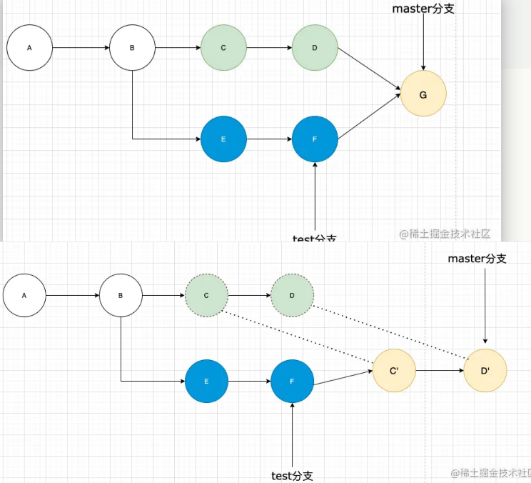 rebaseB分支,合并后只剩下一条线了- 从共同父节点出来所有的变动,会以commit为单位挂到B分支后面