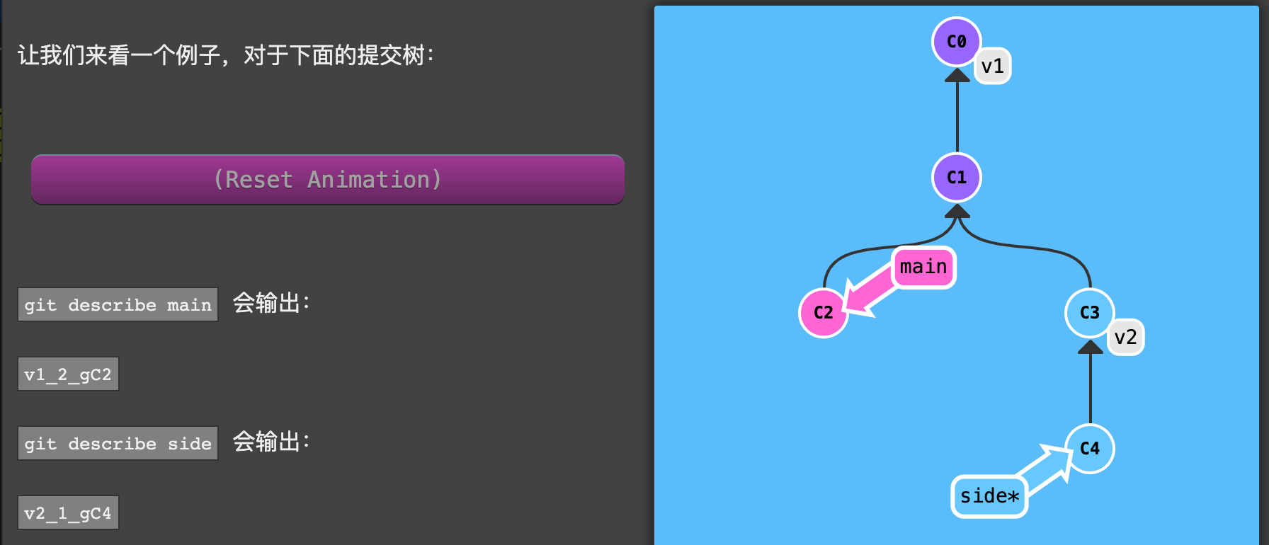 这样看git describe side也就好懂了,就是距离v2有一个提交
