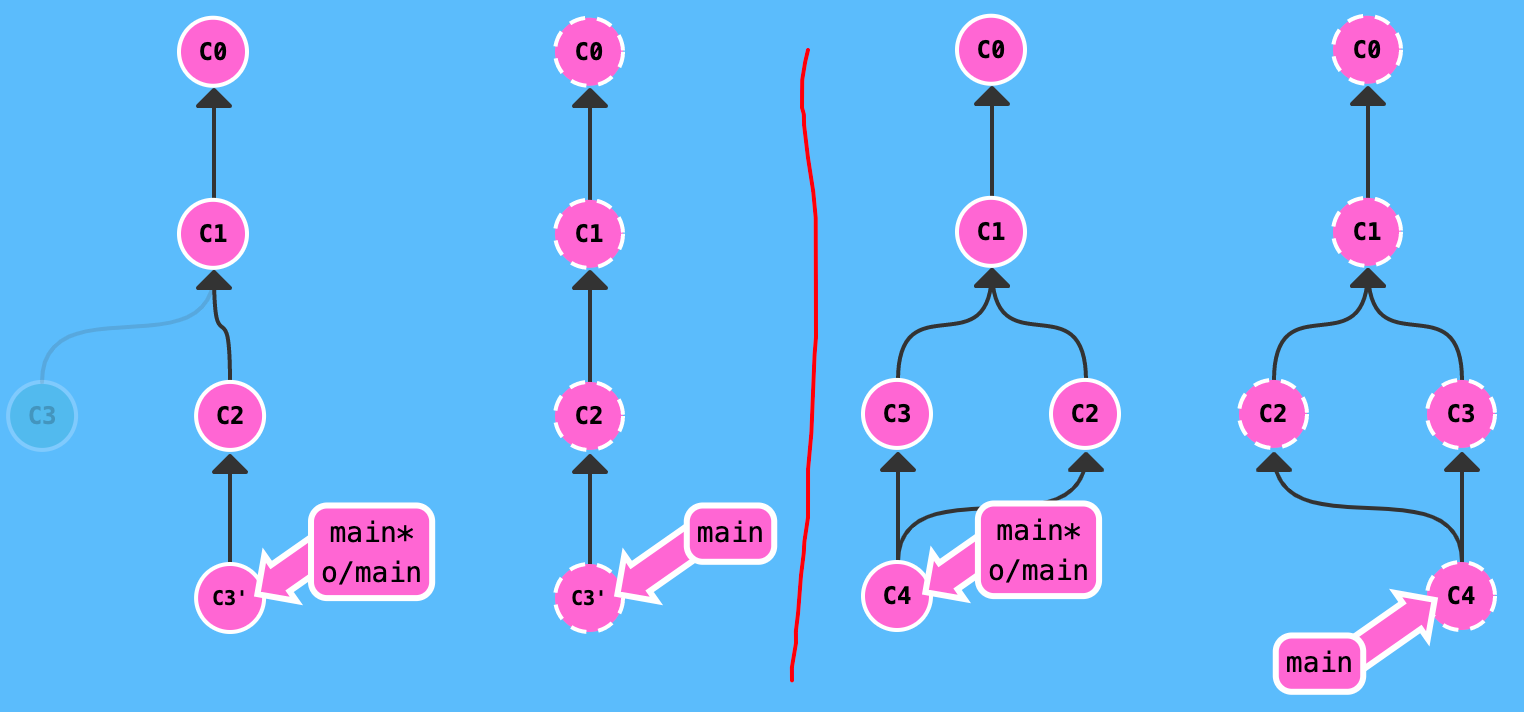 - 比如, 提交 C1 可以被 rebase 到 C3 之后。这看起来 C1 中的工作是在 C3 之后进行的,但实际上是在 C3 之前。