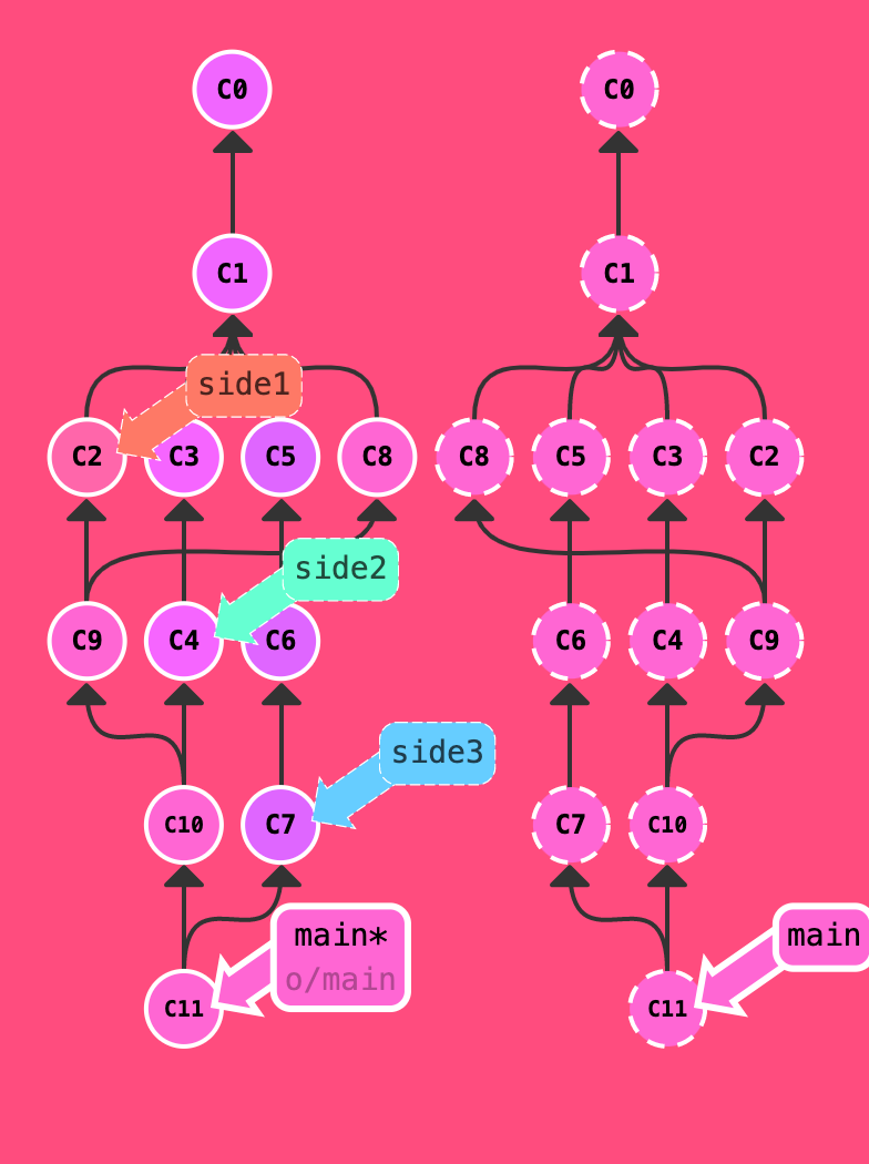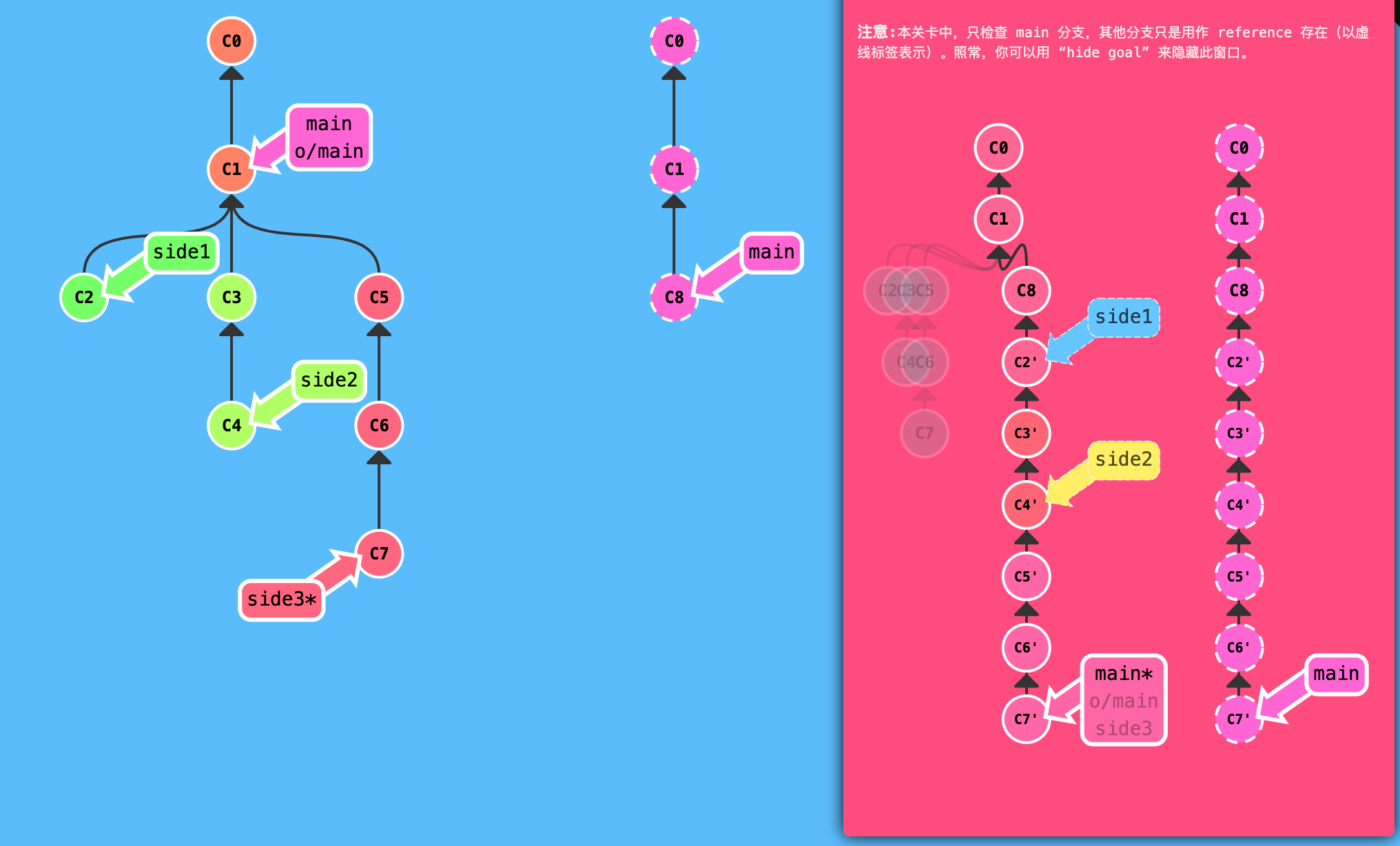git rebase side1 side2 # 记住,是把后面的挂到前面分支