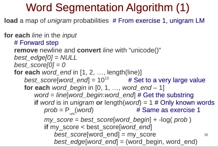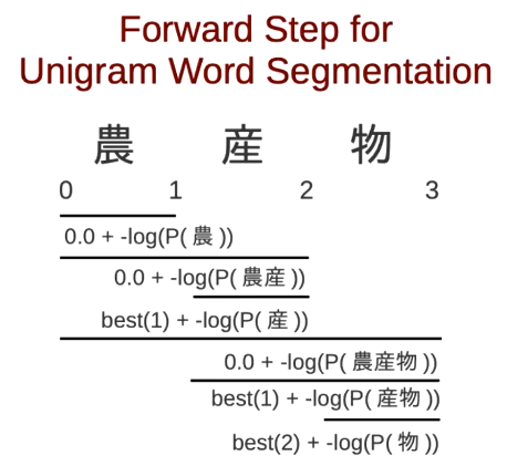 unigramnegative log probability- -log(P(农产)) + -log(P(物)) = 1.4 + 2.3 = 3.7
